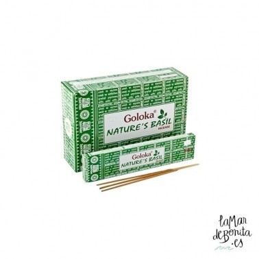 Esta caja de incienso de la marca GOLOKA es una verdadera maravilla y frescura de aroma a Albahaca. Nature´s Basil como se llama este incienso es una mezcla única de flores y hierbas frescas, miel y resinas, con aceites esenciales. Está libre de componentes tóxicos, lo que garantiza una experiencia natural y ambientes relajantes. Colaborando con la disminución de tu tensión arterial o nerviosa, la fatiga, ya sea mental o física.....y ayuda a estados anímicos depresivos. Crear un buen ambiente externo, mejor tu estado emocional interno.