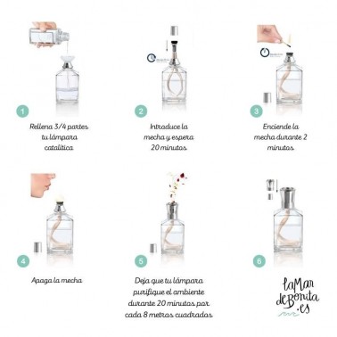 Introduce la fragancia en tu lámpara catalítica, deja que la mecha se empape, enciéndela 20 minutos y apágala: disfrutarás de hasta 20 horas de funcionamiento y 80 horas de transmisión de perfume.