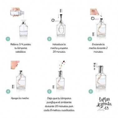 Introduce la fragancia en tu lámpara catalítica, deja que la mecha se empape, enciéndela 20 minutos y apágala: disfrutarás de hasta 20 horas de funcionamiento y 80 horas de transmisión de perfume.