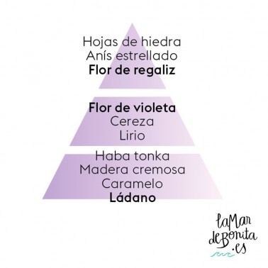 *Pirámide olfativa: en la base haba tonka, madera cremosa, caramelo y Ládano. En su núcleo flor de violeta, cereza y lirio. Notas de salida: hojas de hiedra, anís estrellado y flor de regaliz.