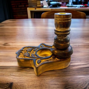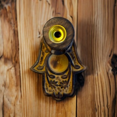 Esta Preciosa fuente tallada en madera de mango de forma artesanal, cuenta con una mano de Fátima donde se vierte en humo simulando el agua que quemo la mano de Fátima. La simbología es preciosa junto con la historia de Fátima, pero eso ya es otro cuento. En la parte superior de metal, cuenta con un soporte donde colocar el cono de reflujo para que no se queme la madera, y así recircular el humo por sus orificios.