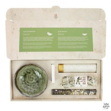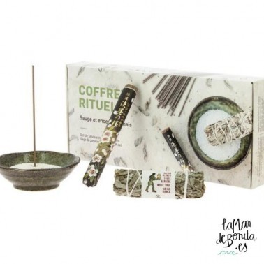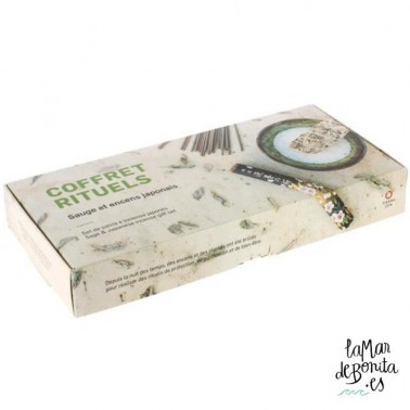 Descripción: Caja: 29,2 x 13,2 x 4,2 cm. Incensario de cerámica: Ø 11 x H 3,4 cm. Salvia blanca 8-10 cm. Incienso japonés Tokusen Sakura Usuzumi: aprox. 50 barritas. Marmolina y cerillas. Caja retractilada con plástico 100% reciclable.