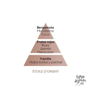 La Fragancia Étoile d’Orient envuelve tu hogar con un aroma cálido y exótico. Sus notas de salida de cítricos y especias se mezclan con un corazón de rosa y jazmín, mientras que el fondo de ámbar, vainilla y madera aporta profundidad y sensualidad. Un perfume misterioso y envolvente que transporta tus sentidos a paisajes orientales.