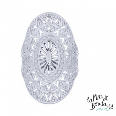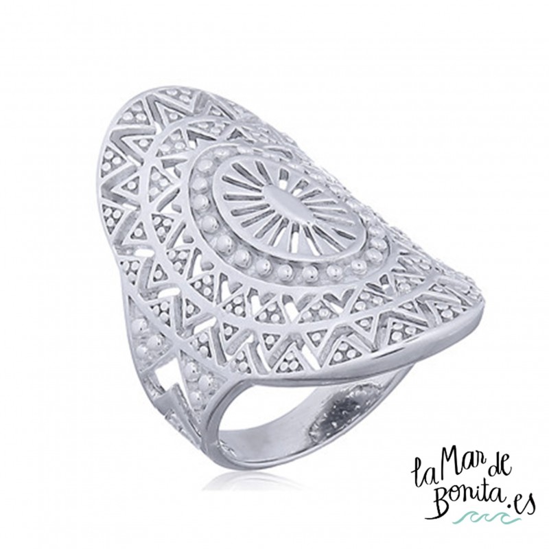 En la joyería de La Mar de Bonita, te traemos este anillo de plata de ley 925 cuyo frente es un precioso trabajo en filigrana con forma de mandala que dará un aire bohemio a tus manos.