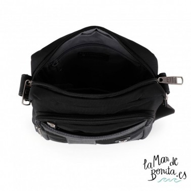 Bandolera de hombre de color negro con dos departamentos con capacidad. Esta bandolera de dos compartimentos es el complemento perfecto para tu día a dia o para un viaje, ya sea de fin de semana o más largo, ya que gracias a sus dos compartimentos podrás llevar todas tus cosas ordendas y al alcance de la mano en todo momento: la bandolera, cuyo interior está forrado, está fabricada en nylon y piel sintética, materiales resitentes y duraderos que aseguran la longevidad del complemento.