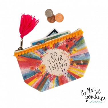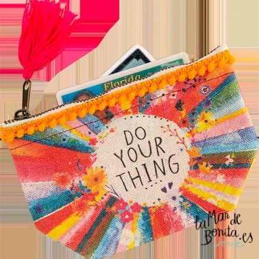 Fondo multicolor con motivos florales y texto en contraste “Do your thing” (haz tus cosas). Cuenta con mini pompones decorativos y tirador de cremallera con borla decorativa.