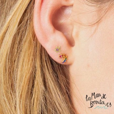 Estos delicados y divertidos pendientes puedes llevarlos en pareja o combinarlos con otros modelos ¡todos quedarán genial! Están chapados en oro con pedrería y los podrás encontrar en la bisutería de La Mar de Bonita. Son muy cómodos de llevar y fáciles de combinar. Además se presentan en una bonita caja protectora con una frase motivadora: La flor no sueña con la abeja, florece y la abeja acude.