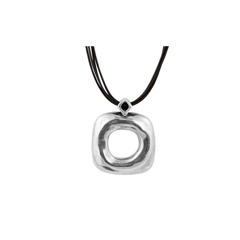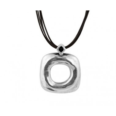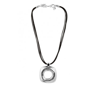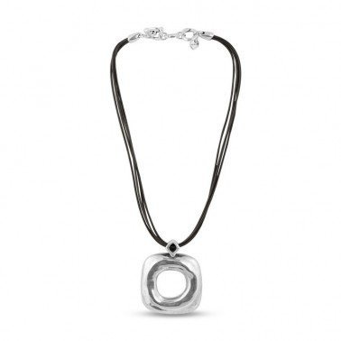 Collar corto de hasta 40cm de largo de doble vuelta de cuero español con pieza de metal bañada en plata en forma de cubo.
