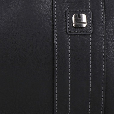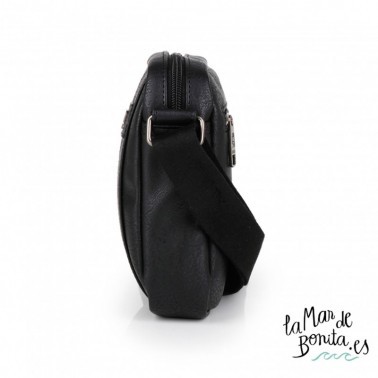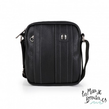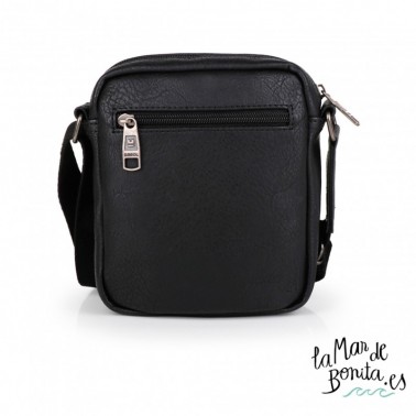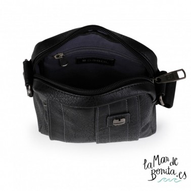 Reportero de caballeroDesert de tamaño pequeño con bolsillo exterior en la parte frontal y diferentes compartimentos interiores. Consta de cremallera para mayor seguridad. Forro interior liso y exterior en piel sintética en color negro con remache bordado en gris. Es un producto de calidad, funcional y con un diseño adaptado a nuestro tiempo. Con cierre de cremallera, bolsillos interioes y exteriores, asas regulables.