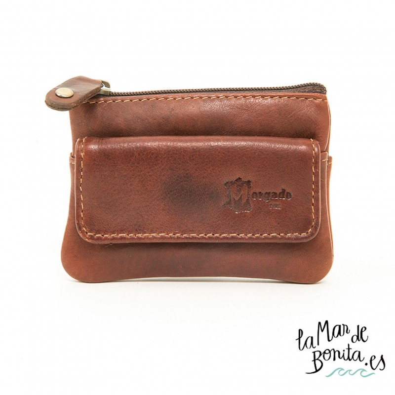 Elegante monedero y llavero en cuero, en colores coñac y marrón. El estilo es un estilo atemporal vintage de fabricación nacional en Málaga la zona de España donde se trabaja el cuero todavía de forma artesanal. La calidad en materiales y costuras hará de esta pieza un elemento que te perdure en el tiempo, solo cambiándolo más por su desgaste que por su rotura.