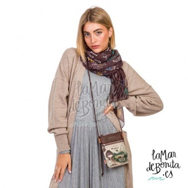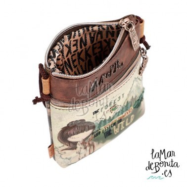 Esta bandolera para mujer es de tamaño pequeño y cuenta con bolsillo frontal. En el frontal puedes ver un estampado inspirado en los bosques de Canadá con bordados y apliques decorativos, donde Anekke alimenta a un precioso alce en un bosque. Todo el frontal respira los colores de la naturaleza más salvaje canadiense, con diferentes tonos verdes, detalles bordados y tonos en plata que simulan la nieve en las montañas de Canadá. La parte trasera es un original estampado de estilo cuadro de leñador, inspirado en un negativo de fotografía en el que se ocultan diversas siluetas de animales y hojas junto a frases inspiradoras. ¿Podrás encontrarlas todas?