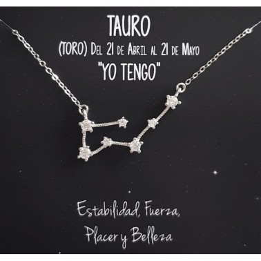 Preciosa gargantilla en plata de ley, que lleva la constelación de Tauro en su colgante. Está con detalles de zirconizas en blanco que representa las estrellas que forman la constelación. Este Signo de Tauro, es un signo zodiacal de TIERRA, también compartido con Virgo y Capricornio que son los tres signos que comparten este elemento. Compartir Tierra hace que tengas unas características que variarán en función de la posición del sol por el día y hora del nacimiento. Por tanto, y a priori, las personas nacidas bajo este elemento, son las que disfrutarán al máximo de los placeres terrenales, así como de los bienes materiales. Un signo muy bien definido por su ¨YO TENGO¨ que representa la estabilidad, fuerza, placeres y la belleza.