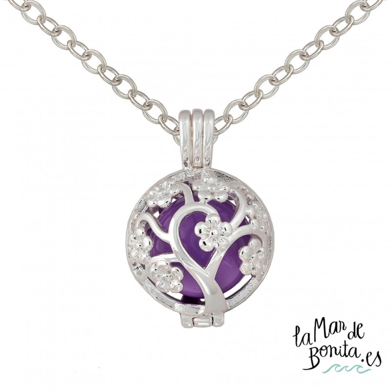 La joyería online de La Mar de Bonita podrás encontrar los llamadores de ángeles más bonitos que puedas encontrar online o en tiendas físicas. Si no, fíjate este bonito llamador realizado en acero con un cascabel morado en su interior y con unas bonitas flores en el diseño del colgante.