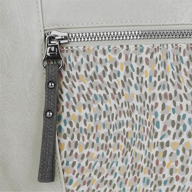 Tienetres compartimentos: uno central con capacidad para3 litros, uno delantero y uno trasero para guardar tus cosas más importantes.Todos loscompartimentos tienen cierre de cremallera y el forro es de topitos blancos con fondo verde claro. Además, dispone de correa antihurto, para tu mayor tranquilidad.