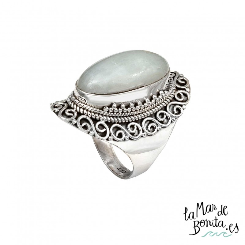 Anillo de Piedra luna de mujer monta la piedra en cabujón de plata de Ley. Auténtico mineral de Piedra Luna, la piedra de los lunaticos, los artitas y la gente más creativa. Se le llama piedra de la luna y tiene los poderes que la luna y su atracción sobre la tierra, las aguas y nosotros los humanos.