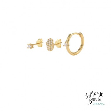 Son un set de 3 piezas únicas con cierre de mariposa o botón para que su colocación sea fácil y segura. Estos pendientes demujer con circonitas están pensados tanto si tienes 3 agujeros en la misma oreja, creando maravillosas combinaciones y formando preciosas constelaciones con su brillo, o colocando en ambas orejas y otros pendientes en oro, eso lo dejamos a tu imaginación.