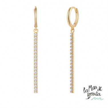 Aros lisos en plata de ley 925 y bañados en oro para darles actualidad y calidad a la pieza. Esos aros están montados con circonitas blancas cortadas con laser y facetadas. En forma de colgante como basón liso recto.