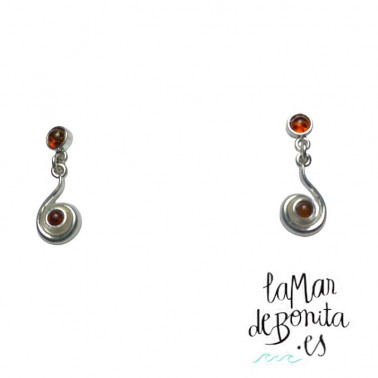 Pendientes de ámbar de mujer en plata de ley 925, montados en plata pulida y con piezas de ámbar selladas a la joya. Una pequeñas piezas en la parte inferior y superior con forma de semicirculo con el que se coloca en la oreja con cierre de plata de botón o tuerca de presión para su fácil colocación y un cierre seguro.