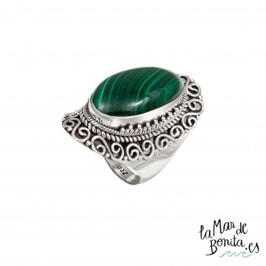 Este anillo de mujer en plata de ley 925 es una de nuestras piezas trabajadas con filigranas en los talleres y que monta la piedra de malaquita, recomendada para el 7 chakra y que desde la historia se ha creido en sus poderes de equilibrar las emociones, fomentar lo espiritual y combatir la pereza con un crecimiento personal e interior.