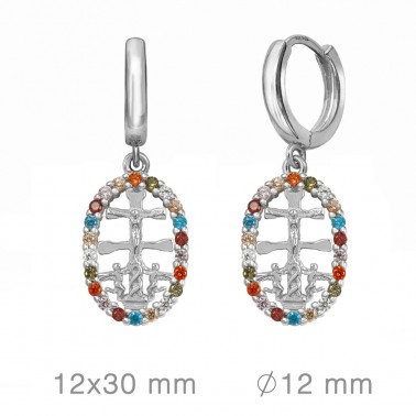 Aros de mujer fabricados en plata 925 con circonitas en su ovalo y el simbolo de la cruz de caravaca en el centro. Los cierres son seguros de click para los aros y faciles de poner.