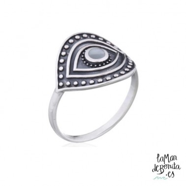 Precioso anillo ovalado fabricado en plata de Ley 925 pulida, con una pequeña piedra semipreciosa reconstruida de turmalina en color turquesa, negro y blanco nacar tiene una clara forma del ojo que todo lo vé. A juego, su colgante PD34732 y sus pendientes con gancho hippie PE19851 un conjunto perfecto para regalar en cualquier ocasión.