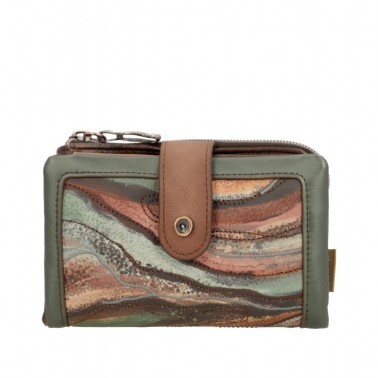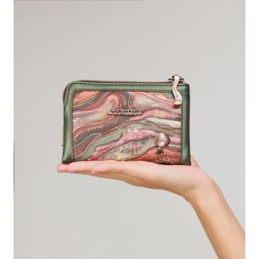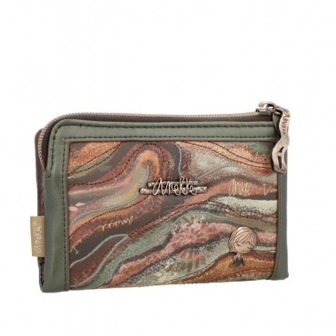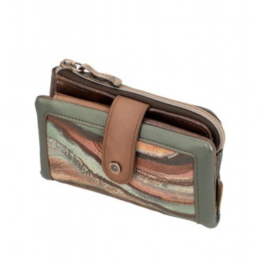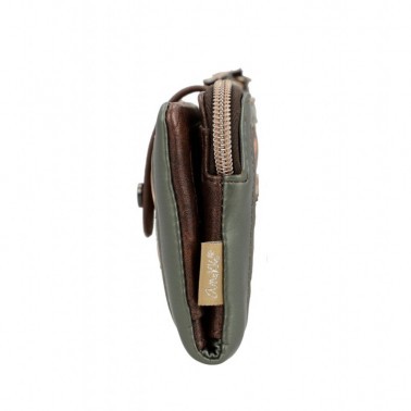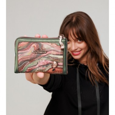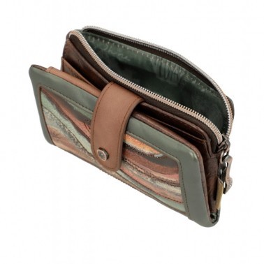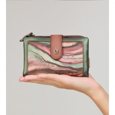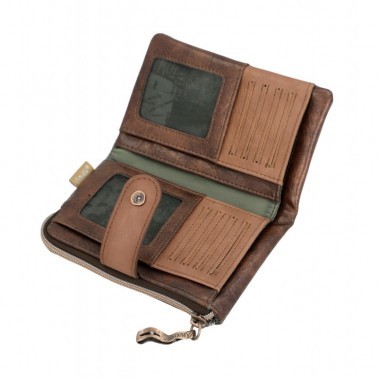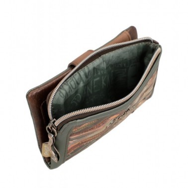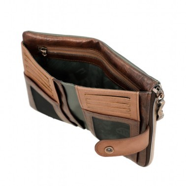 Este billetero de tamaño mediano está realizado con material flexible, y cuenta con dos compartimentos principales: la parte trasera, donde encontrarás un amplio billetero y espacio para billetes y/o tarjetas. En la parte superior cuenta con cremallera, y en el interior podrás guardar monedas. Todo el interior va forrado.