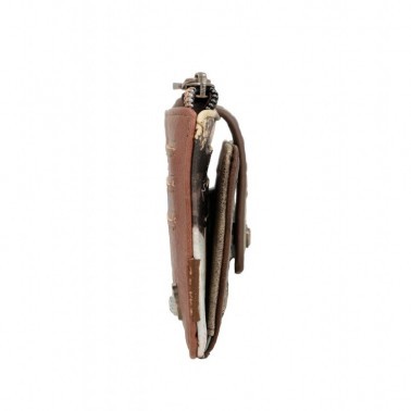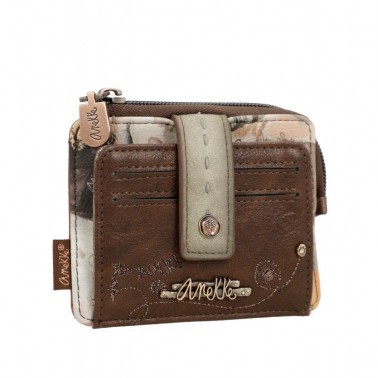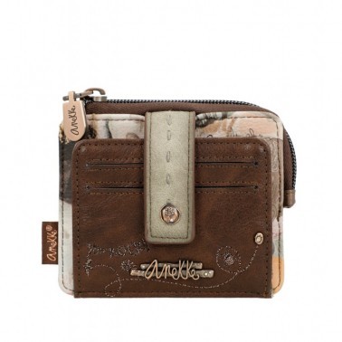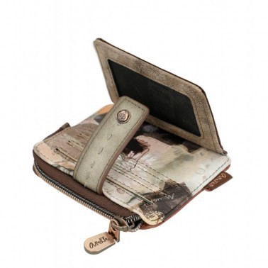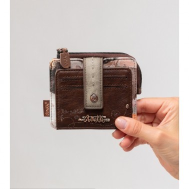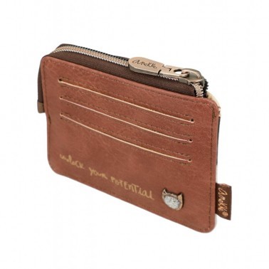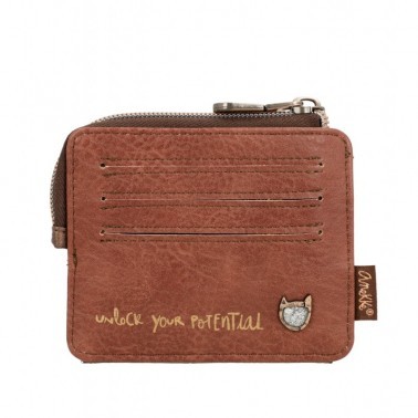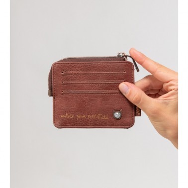 Este tarjetero es de tamaño pequeño. Cuenta con dos compartimentos: uno frontal que se abre mediante lengüeta, cuyo interior alberga espacio para tarjetas, y uno superior con cremallera para monedas. El interior va forrado.