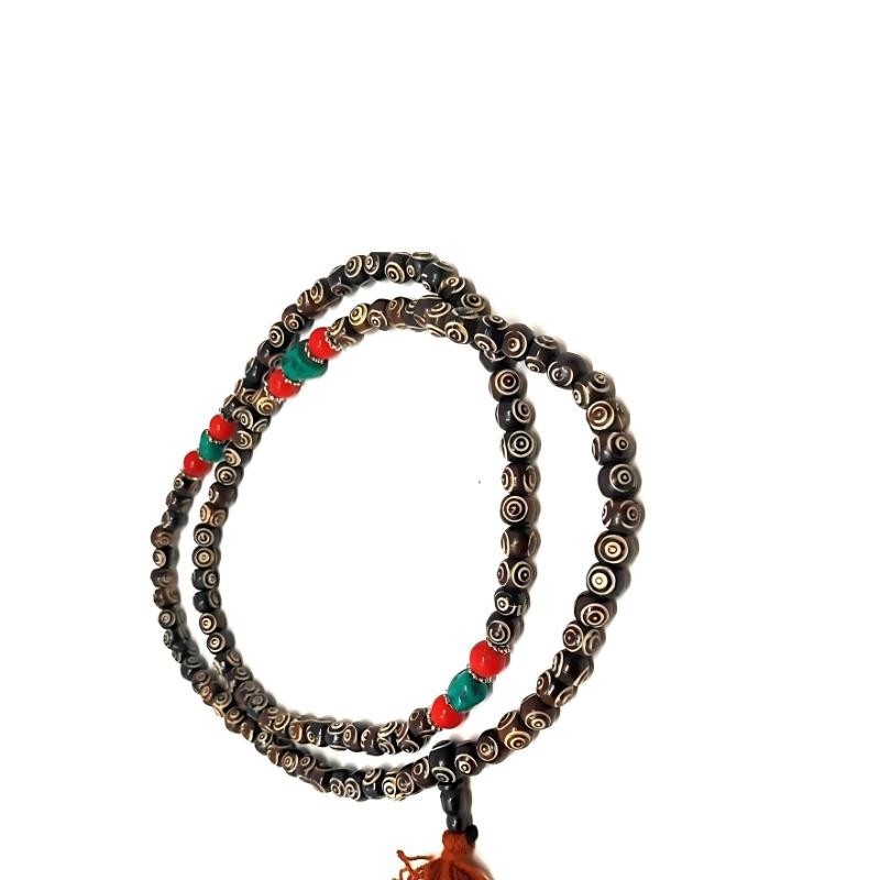 La japamala de hueso oscuro grabado con piedras combina tradición, energía protectora y estilo en una pieza única. Cada cuenta de hueso está cuidadosamente trabajada con grabados, mientras que las piedras aportan equilibrio, claridad y conexión espiritual.
