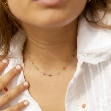 Vibrante, alegre y llena de personalidad, esta gargantilla combina la resistencia del acero inoxidable con la energía y los tonos variados del mineral multicolor, una piedra que simboliza equilibrio, vitalidad y creatividad.