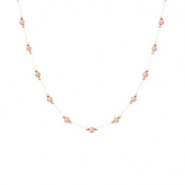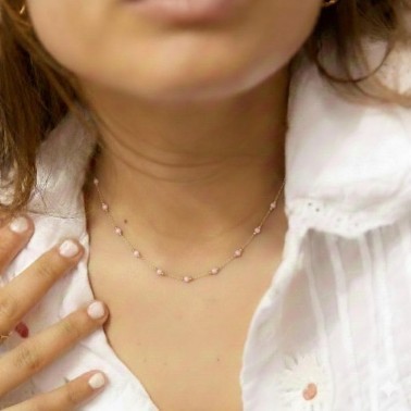 Delicada, elegante y con un toque romántico, esta gargantilla combina la resistencia del acero inoxidable con la suavidad del mineral rosa, una piedra asociada a la calma, la armonía y el amor propio.