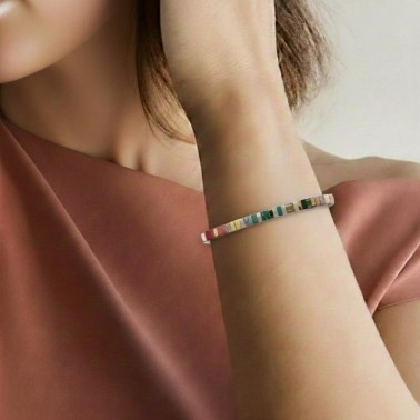 Cada cuenta ha sido cuidadosamente seleccionada, creando un acabado armonioso y lleno de personalidad que convierte esta pulsera en un accesorio versátil y especial.