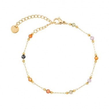 Vibrante, elegante y llena de estilo, esta pulsera rígida de acero dorado combina la resistencia del metal con minerales multicolor, creando un accesorio único que aporta personalidad y alegría a cualquier look.