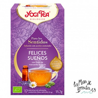 La infusión Felices Sueños de Yogi Tea está pensada y creada para ayudarte a dormir sin ninguna complicación. Para ello se han mezclado ingredientes relajantes con el aceite esencial de lavanda para que aporte también su magia. Entre los ingredientes principales destacaremos la lavanda, las flores de manzanilla y el lúpulo.