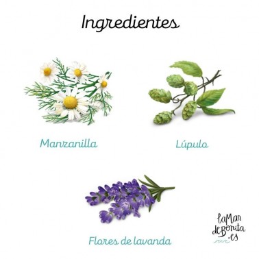 Ingredientes: Hinojo, Menta piperita, Hierba limón, Flores de manzanilla, Melisa, Salvia, Flores de lavanda, Cardamomo, Lúpulo, Aceite esencial de lavanda, Nuez moscada