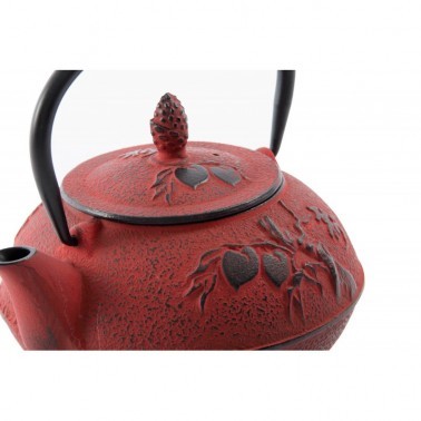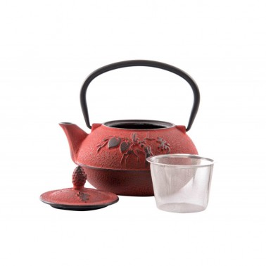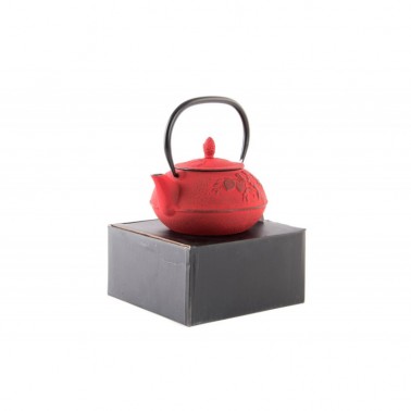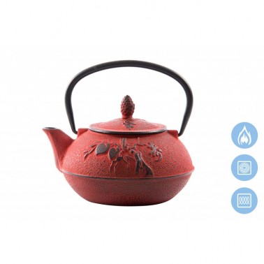Tetera de hierro colado disponible en color rojo con dibujo oriental. Consta de tapa y filtro para té e infusiones.