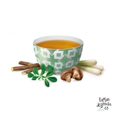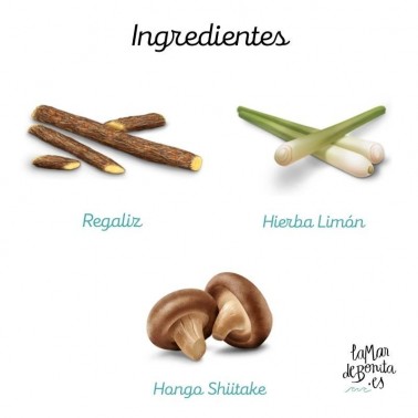 Ingredientes: Hierba limón, regaliz, hongo shiitake, fenogreco, flores de saúco, flores de tila, albahaca, moringa, bebida de kombucha deshidratada