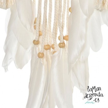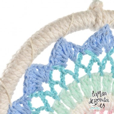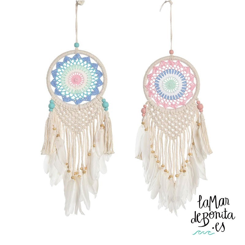 ¿Alguna vez pensaste que el macramé te ayudaría a dormir? Con este atrapasueños realizado en macramé y con unos preciosos colores, podrás cerrar los ojos y sumergirte en una experiencia nueva a la hora de descansar y tener sueños plácidos y creativos. Lo puedes comprar en dos colores principales: azul y rosa, y con su parte inferior llena de plumas, tendrás un elemento decorativo que dará ligereza a tu espacio, así como tranquilidad.