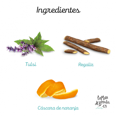 *Ingredientes: tulsi, albahaca, regaliz, jengibre, hierba limón, cáscara de naranja, canela, cáscara de limón, aceite esencial de naranja, lima, pimienta negra, cardamomo, clavo, estragón.