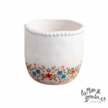 En la sección de hogar de La Mar de Bonita siempre es primavera si tú quieres. Por eso tenemos para ti esta sencilla y bonita maceta en blanco y con una línea de bonitas flores de colores dibujadas en su base, con un acabado artesanal irregular en su parte superior que la hace única y diferente.