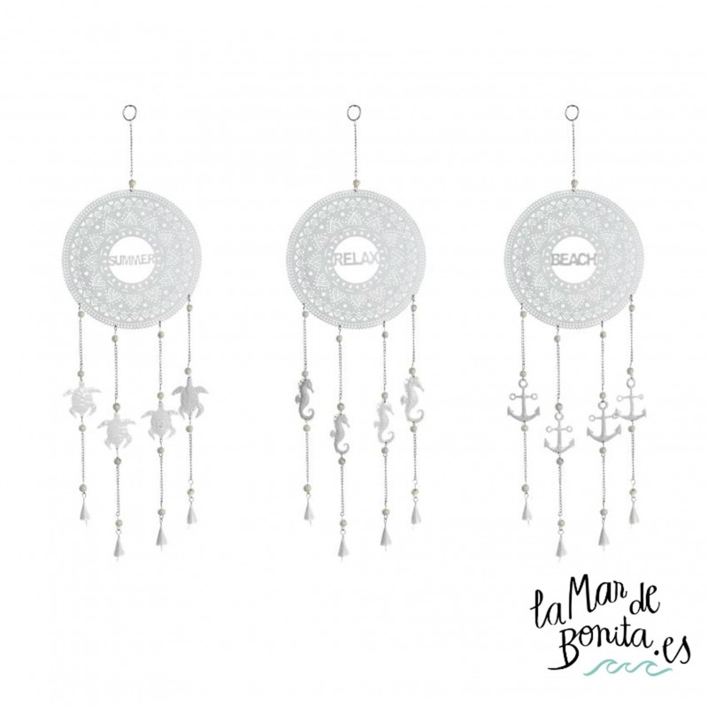 Si quieres tener cerca de ti la tranquilidad, calor y el sonido de la playa, cualquiera de estos colgantes de decoración para tu hogar, te acercará la playa hasta donde estás tú. Realizados en color blanco y en metal, tienes modelos a elegir: uno que indica SUMMER en su parte central y del que cuelgan cuatro bonitas tortugas. Otro que en su parte central pone RELAX y del que cuelgan cuatro graciosos caballitos de mar y el tercero que pone en su parte central BEACH, y del que cuelgan cuatro anclas de barco.