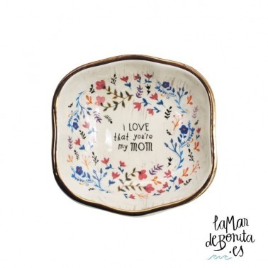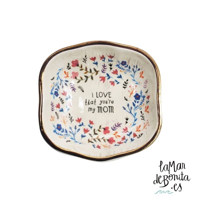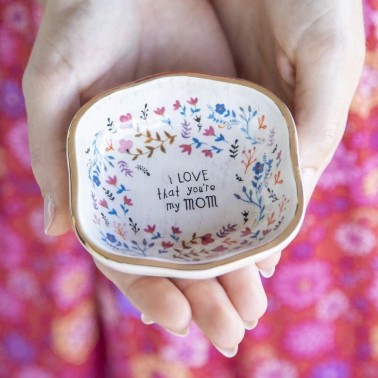 "¡Me encanta que seas mi madre!". ¿A que a todas las madres les encantaría oír esas palabras todos los días? Ahora podrá verlas cuando le regales nuestro cuenco de cerámica Antiqued Trinket Bowl de estilo artesanal. No sólo tiene un colorido boho, sino que además está ribeteado en dorado. Es un regalo personalizado y encantador que sabrá apreciar. Cada cuenco tiene un aspecto envejecido, por lo que se producen ligeras variaciones. Cada vez que mamá lo use, recordará que la quieren. Tienen el tamaño perfecto para pulseras, anillos o cualquier cosa pequeña. Un Trinket Bowl sobre un escritorio puede contener material de oficina o monedas sueltas. Nos encanta dar a los objetos cotidianos un hogar en algo especial que le hará sonreír. ¡Haz a tu mamá súper feliz!