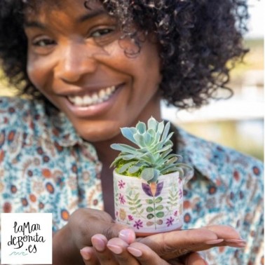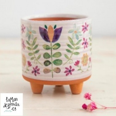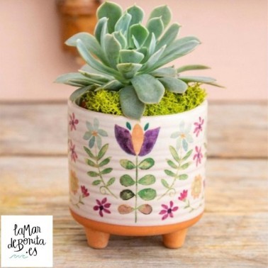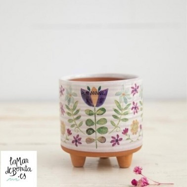 Maceta Natural Life de barro cocido tipo terracota, esta pintada de forma artesanal a mano,vamos. Estádecorado las hojas y flores con tonos lila y fucsia preciosos. El trabajo es delicado, y están pensadas para personas que buscan el detalle en cada rincón de la casa. Tiene tres patitas de soporte cónicas que le dan una pequeña elevación sobre la superficie. Ideal para mesas de oficina, encimeras de cocina, aparadores o cualquier lugar donde que quiera poner más vida.