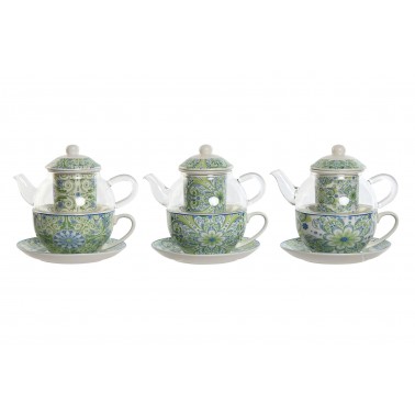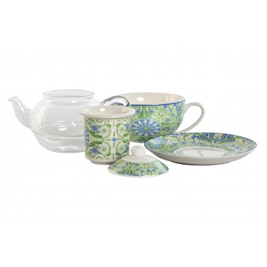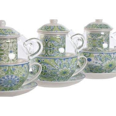 Preciosa tetera cristal con taza de porcelana en conjunto de piezas, con un plato, su taza de té al más puro british, y con una parte superior de cristal que forma la tetéra con su filtro de porcelana con el precioso dibujo a juego con la taza también de porcelana. Además, para que no se te enfrie, consta de una taza de procelana a juego con el precioso dibujo de plato, taza y filtro de hierbas.