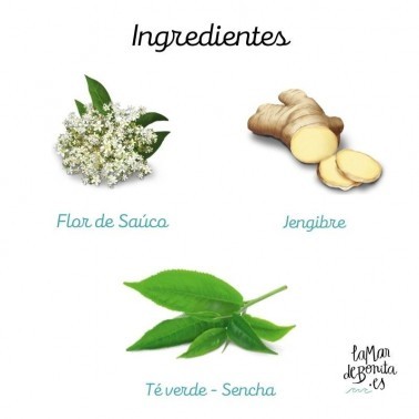 Ingredientes: Té verde (65%), hierba limón, guaraná (7%), menta piperita, flores de saúco (3%), jengibre (2,5%), aroma natural de fresa, pimienta negra, bebida de kombucha deshidratada, aceite de bergamota, hierba luisa, aceite esencial de limón, vainilla en vaina, aroma natural de vainilla, extracto natural de fruta de la pasión.