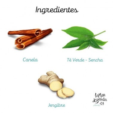 Ingredientes: Canela (30%), hierbabuena (21%), té verde (20%), jengibre (9%), cardamomo (8%), clavo, pimienta negra, aceite de canela