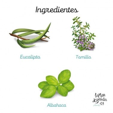Ingredientes: Eucalipto (26%), regaliz, jengibre, albahaca (6%), cardamomo, canela, gordolobo, alfalfa, hinojo, tomillo, énula, extracto de vainilla, clavo, pimienta negra, vainilla en vaina