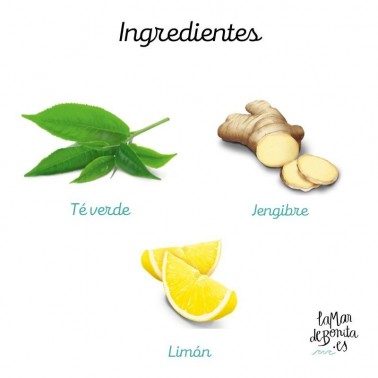 Té verde*, jengibre*, regaliz**, hierba limón*, aceite esencial del limón*, cáscara de limón*, menta piperita*, pimienta negra*, aceite de jengibre*