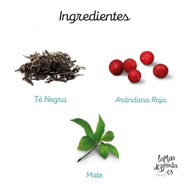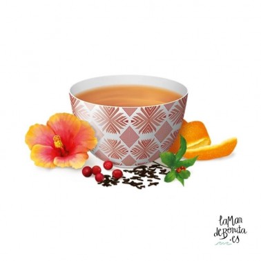 Ingredientes: Té negro, hibisco, hierba mate, regaliz, hierba limón, zumo de limón deshidratado, rosa canina, remolacha, arándonos rojos, canela, pimienta negra, cáscara de naranja, romero, aceite esencial de naranja, jengibre