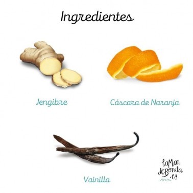 Ingredientes: Jengibre, regaliz, hierba limón, cáscara de naranja, pimienta negra, extracto de vainilla, aceite esencial de naranja, menta piperita, anís