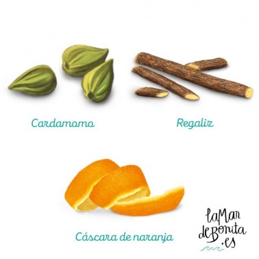 Regaliz**, canela*, cáscara de naranja*, jengibre*, cardamomo*, achicoria tostada*, clavo*, aceite de naranja*, pimienta negra*, extracto de vainilla*.